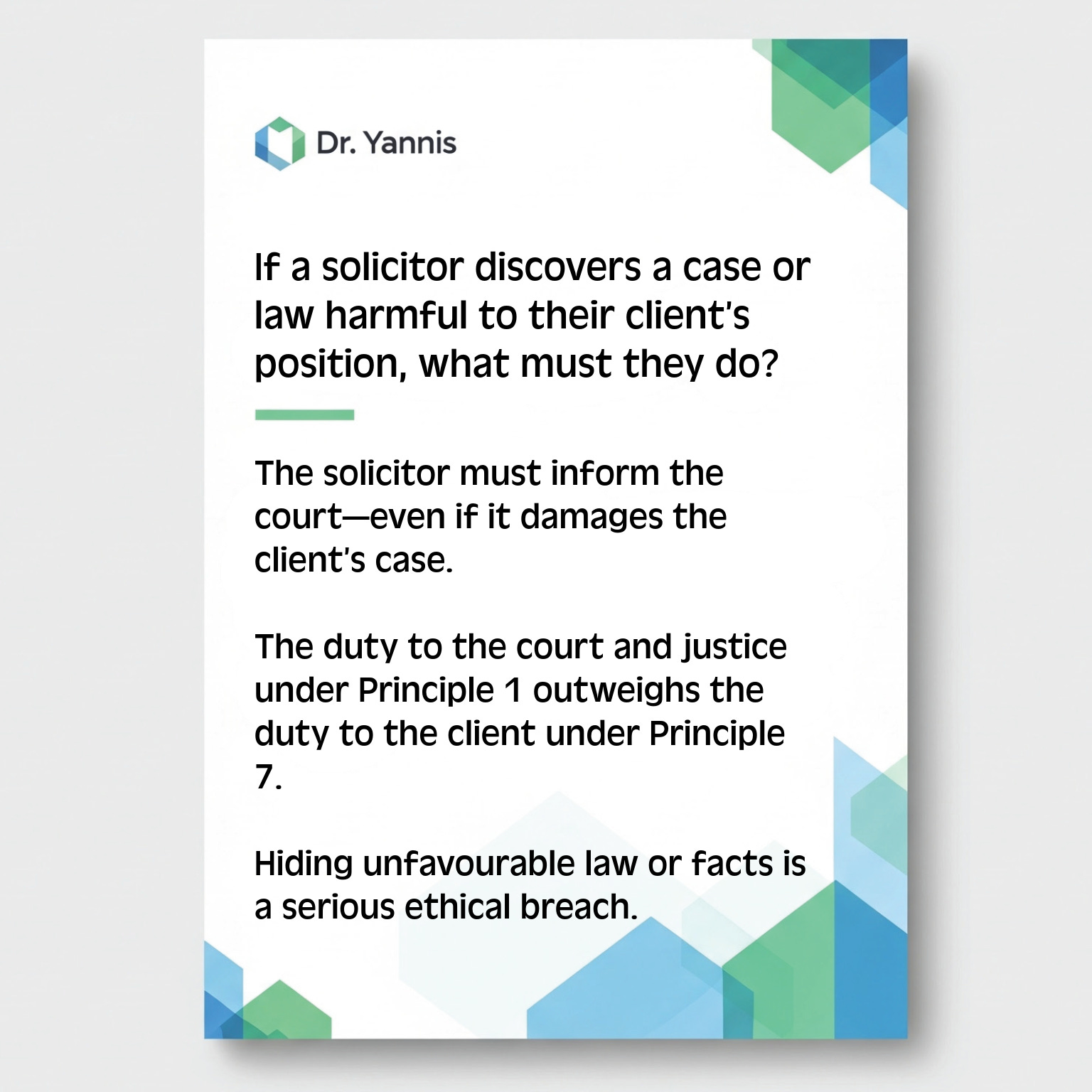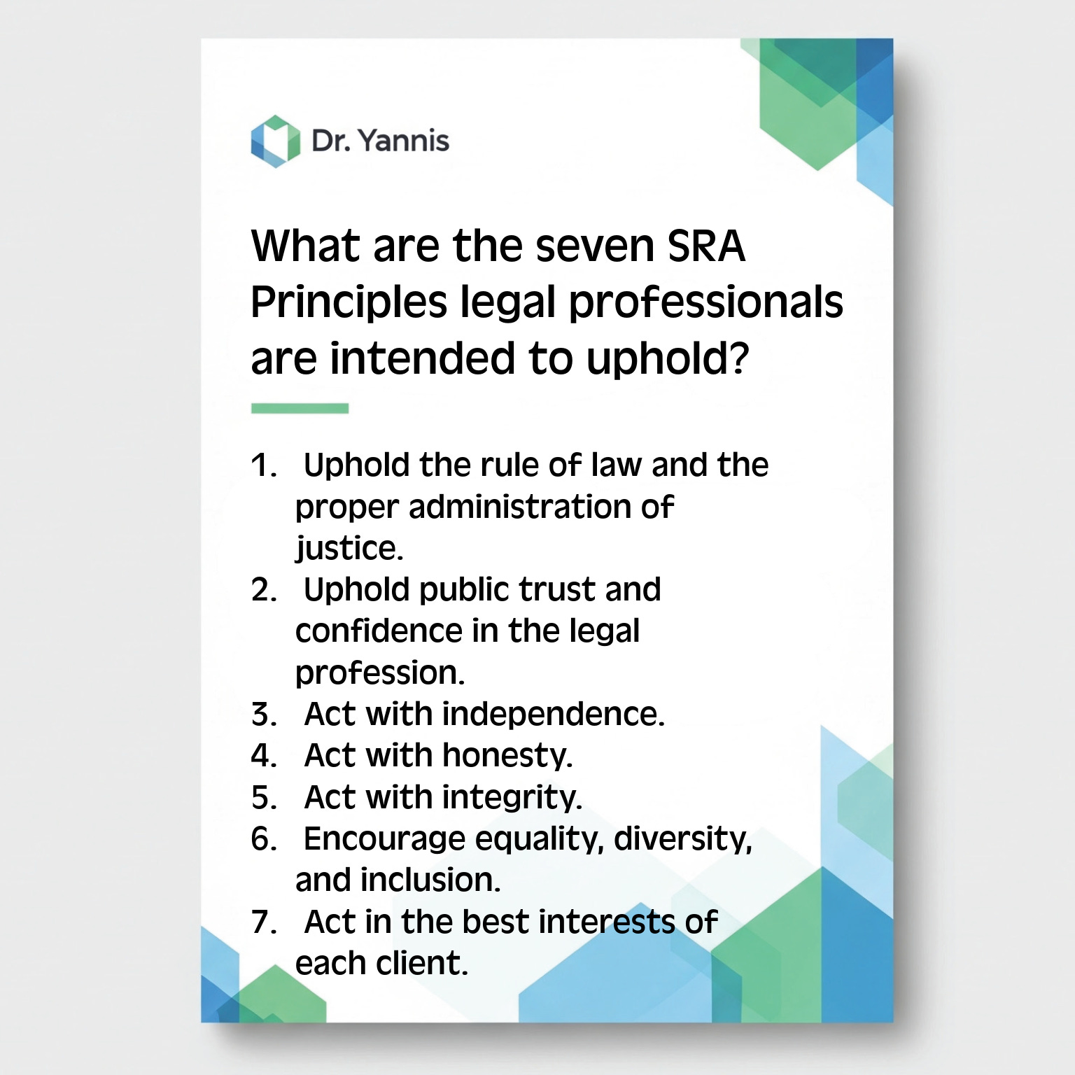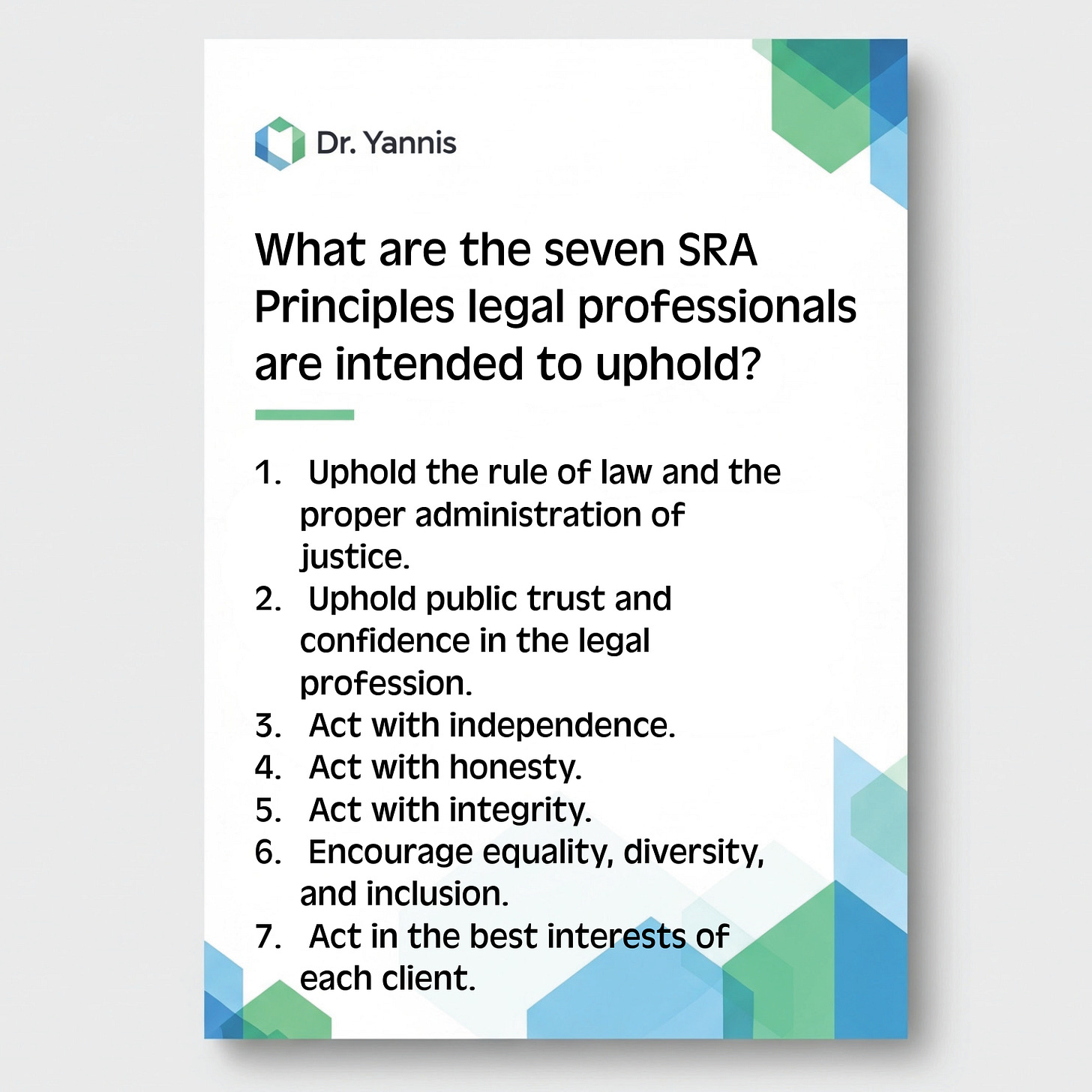 Flashcards: SRA PrinciplesSQE FLK need-to-know info in your hands!Ioannis GlinavosDec 29, 2025ShareThe 7 SRA Principles legal professionals must uphold:Dr Yannis is a reader-supported publication. To receive new posts and support my work, consider becoming a free or paid subscriber.SubscribePreviousNext